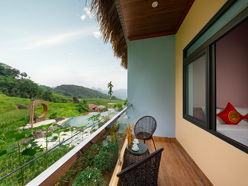 Bước vào căn phòng, du khách sẽ choáng ngợp bởi không gian rộng rãi và sang trọng, được bài trí tinh tế với gam màu trang nhã. Cùng với đó, chiếc ban công rộng lớn mở ra trước mắt du khách bức tranh thiên nhiên hùng vĩ và yên bình, với hồ bơi xanh mướt, ruộng bậc thang uốn lượn, dãy núi non trùng điệp và con suối nhỏ êm đềm chảy. Đặc biệt, vào khoảnh khắc bình minh và hoàng hôn, khung cảnh nơi đây càng trở nên thơ mộng, cho du khách cảm giác ngỡ như lạc bước vào chốn tiên cảnh.