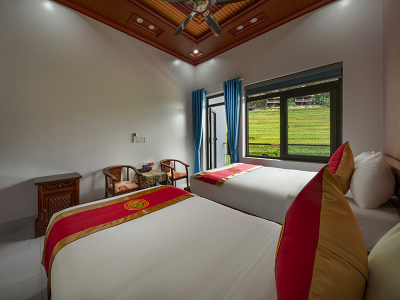 Với vị trí đặc địa, nằm gần ruộng bậc thang, du khách có thể dễ dàng di chuyển và khám phá nét đẹp độc đáo của Pù Luông. Hơn thế nữa, phòng Deluxe Twin còn được trang bị đầy đủ tiện nghi hiện đại như giường ngủ êm ái, bàn làm việc rộng rãi, tủ quần áo tiện lợi, tivi thông minh, wifi tốc độ cao, ... đáp ứng mọi nhu cầu của du khách.